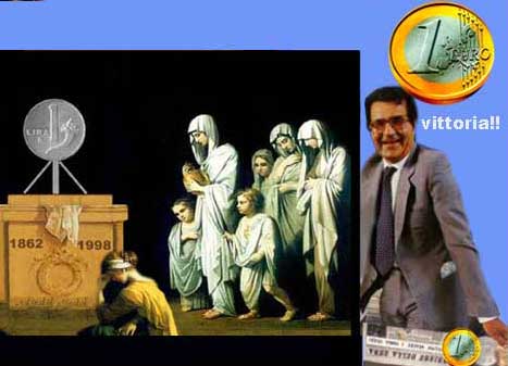 Nel giorno della nascita dell'Euro il commento di molti suoi avversari é stato che PRODI si sarebbe potuto benissimo risparmiare il discorso fatto agli italiani e tanti trionfalismi : certe cose riascoltate dopo molti anni, se poi dovesse andare male, potrebbero apparire ridicole e sicuramente amare pensando a quanto é costato all'Italia questo "ingresso" : migliaia di miliardi per ora, e nessuno si azzarda a fare previsioni per il futuro e quanti sacrifici occorreranno ancora.Qualcuno dice che é una pistola puntata alla tempia.