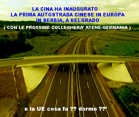 La vecchia Jugoslavia cioè la SERBIA, che ha bussato per anni alla porta dell’Ue che non ha mai voluto che vi entrasse, ora é invasa dalla CINA che ha già investito sul suo territorio ingenti risorse. Megaprogetti faraonici in autostrade e ferrovie, dal Porto del Pireo di Atene (già a gestione cinese) a Belgrado nell’ottica della "Nuova Via della Seta" di Xi Jinping verso l'Europa. Pochi giorni fa (settembre) proprio in Serbia la Cina ha (con mesi di anticipo e con noi tutti zitti) inaugurato, la prima autostrada cinese in Europa.