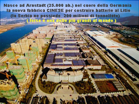 Ad Arnstadt nel cuore della Germania (una piccola cittadina di 25.000 abitanti), la Cina ha oggi nella sua nuova grande fabbrica europea (vedi foto sopra) con la sua CATL (uno dei maggiori produttori mondiali di batterie al litio) ha messo la sua sede e gli stabilimenti e ci sta investendo due miliardi di dollari.