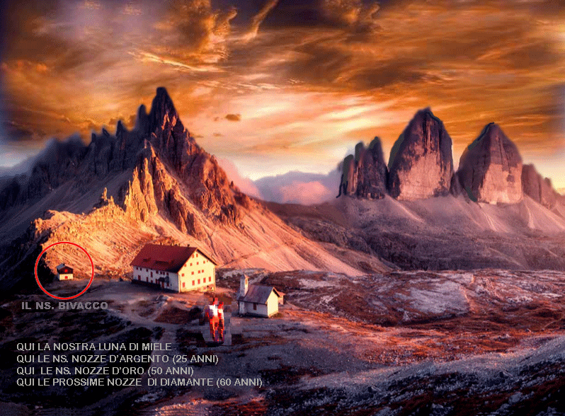 Così oggi io 90 enne e mia moglie 84 enne, siamo vivi e vegeti e in ottima salute. Non ci mancano i ricordi della favolosa avventura vissuta insieme (in 58 volumi di fotografie e decine di filmati). Siamo anche spesso ritornati nello stesso luogo dove ci siamo conosciuti dove io gli donai l'anello di fidanzamento, alle..... 3 CIME DI LAVAREDO (al BIVACCO !!) , dove poi lì abbiamo fatto anche la ns. Luna di Miele: vi siamo poi ritornati e abbiamo celebrate le Nozze d'Argento (25 anni), poi le Nozze d'oro (50 anni), e stiamo arrivando (mancano 2 anni) a quelle di diamante 60 anni del nostro felicissimo matrimonio !!