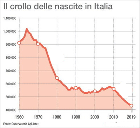 e non ci saranno più italiani. E' matematico, guardando la tabella qui sotto. In 40 anni abbiamo dimezzato le nascite
