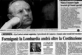 Bossi pero' liquida cosi' le frasi di Amato "macche' aperture! il suo e' solo un bluff. Amato e' un furbacchione che cerca di evitare il fulmine che lo incenerira'. Basta rileggersi quello che in materia di federalismo lo stesso Amato diceva fino a qualche tempo fa". E che i rapporti fra Governo e regioni del Nord siano ben lungi dal migliorare lo testimoniano le parole del Ministro degli Affari Regionali Agazio Loiero, secondo il quale "il potere che e' nelle mani dei presidente di regione e' mostruoso. Francamente mette i brividi sentir parlare di voler andare oltre la Costituzione, io dietro l'attivismo delle regioni del Nord vedo solo il disegno leghista delle due Italie". Immediata la replica di Formigoni "i brividi semmai li mette Loiero con le sue dichiarazioni. Noi abbiamo gli stessi poteri che avevano i presidenti di regione negli anni 80. E secondo Loiero questi sarebbero mostruosi?".
