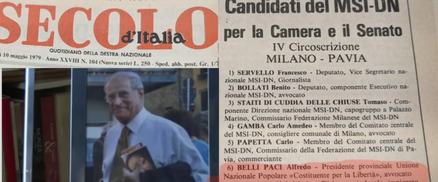 ALFREDO BELLI PACI per quei pochi voti presi, diede forse la colpa ai missini o non voleva essere pure lui coinvolto nelle accuse che si facevano ai missini. Non solo abbandonò il MSI ma abbandonò la politica. Diventando lui e la moglie da quel momemto simpatizzanti della sinistra per poi rimanerci fino ai giorni nostri, diventando la moglie così fanatica "antifascista" che solo per aver accennato qualcuno a un monumento ad Almirante, si è scandalizzata. Eppure per 25 anni Almirante doveva essere di casa. - Qualcosa non quadra. (una maggiore sintesi in queste pagine >>>>>
