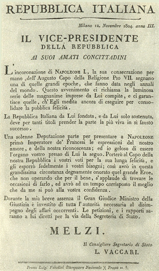 Così quella repubblica ottenne una costituzione, ma il potere e la nomina dei funzionari stava essenzialmente in mani straniere. Tuttavia si ebbe un periodo di quiete e si poté prendere una serie di disposizioni benefiche. A dire il vero vi fu anche un gran malcontento, specialmente a cagione dell'occupazione francese per mezzo di un'armata che rimase nel paese. Il Melzi fu molte volte sospettato, ma anche contro il suo volere mantenne la carica, finché Bonaparte nel maggio 1805 si pose in capo la corona ferrea dei Lombardi.